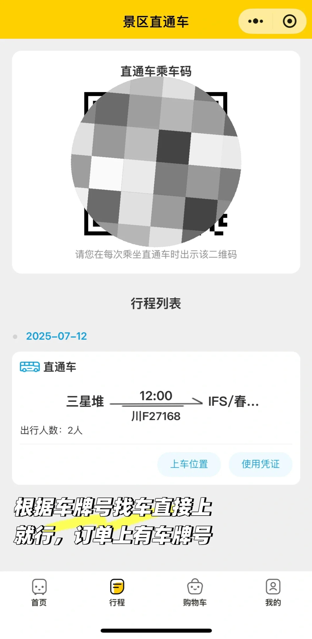 最后,我是提前在小程序“成都直通车”买了票,如图,进景区门口时,就有大的指示牌告诉你直通车在哪儿坐,然后那个小程序还会显示车牌号,在那一堆停车点找找就行