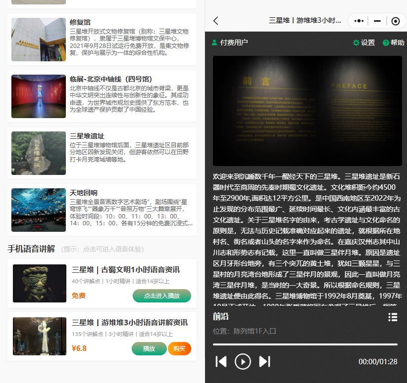 关于需要免费三星堆讲解的,你使用微信搜索“游堆堆小程序”,三星堆本地攻略小程序,上面每天更新大量三星堆攻略,以及提供免费的三星堆语音讲解,免费版一个小时已经满足普通游客想要了解三星堆博物馆和三星堆博物馆的文物,如果想要了解更全面,可以购买付费版!