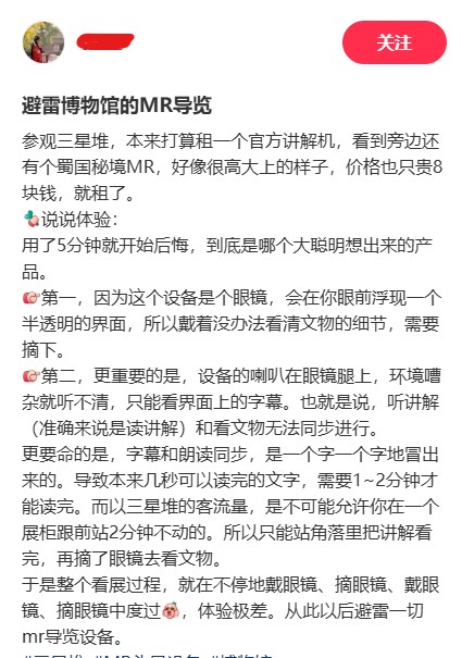 三星堆博物馆提供的电子讲解器分为官方租赁款、MR科技款及第三方小程序款,整体能满足自主游览需求,但不同类型各有优劣,是否好用需结合自身需求判断,以下是收集的小红书用户使用信息的总结: